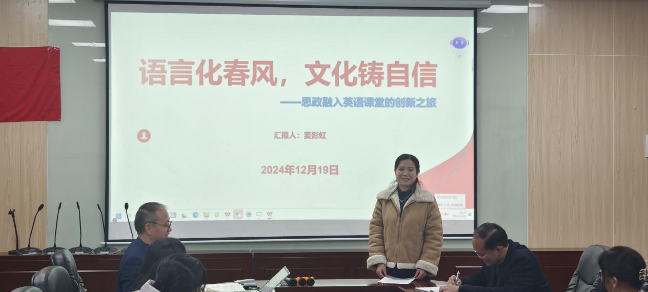 麦影虹认真分享了其在全国高校外语课程思政教学案例大赛中的五点体会,深入阐述了将文化自信融入英语教学的创新实践,重点突出英语演讲修辞与思政教育内容的深度交融,获得学生的好评。范俊英则从语言、思维和行动三个维度,生动阐述了在课程思政教学案例设计中的思考与探索。在语言维度上,强调了语言不仅是沟通的工具,更是传递文化和价值观的载体。范俊英指出,要通过精心设计课堂语言,使之既能够准确传达知识,又能潜移默化地培养学生的社会主义核心价值观。在思维维度上,探讨了如何通过教学活动激发学生的批判性思维和创造性思维。在行动维度上,突出了如何将思政教育融入到学生的日常生活中,鼓励学生将所学知识转化为实际行动。